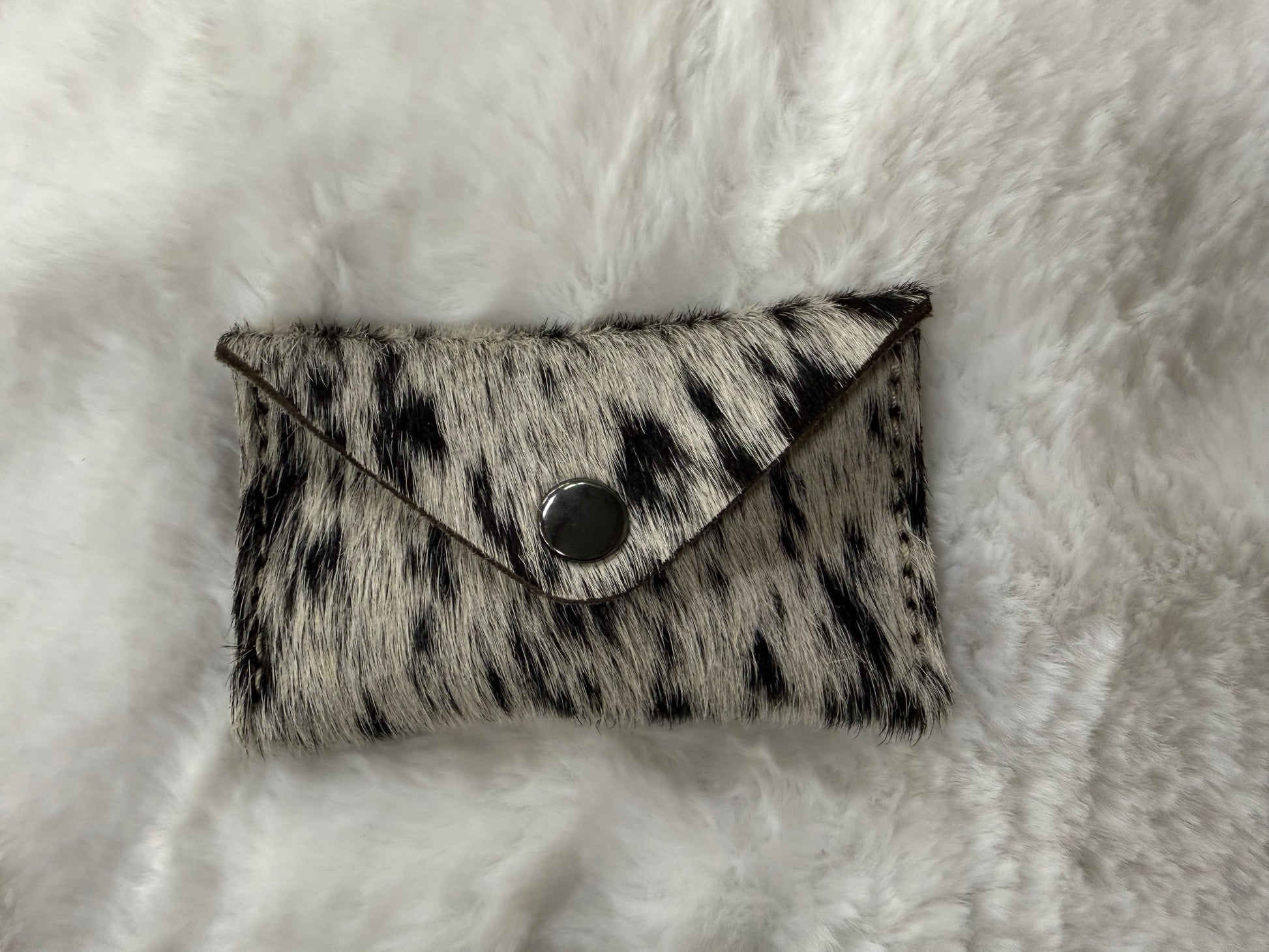 Envelope wallet crafted from genuine hair on hide leather. Hand-stitched details add character, while a satisfying snap closure keeps everything secure. Compact, quirky, and ready for adventure.